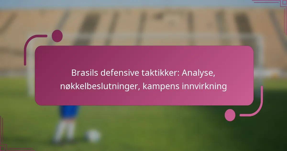 Brasils defensive taktikk i fotball kjennetegnes av strukturerte formasjoner og strategiske spillerroller som muliggjør et motstandsdyktig og tilpasningsdyktig forsvar. Nøkkelbeslutninger tatt av trenere, inkludert taktiske justeringer og bytter, spiller en avgjørende rolle i å forme lagets prestasjoner mot ulike motstandere. Effektiviteten av dette forsvaret avhenger av sterk kommunikasjon, individuelle ferdigheter og evnen til å respondere på varierende kampforhold.